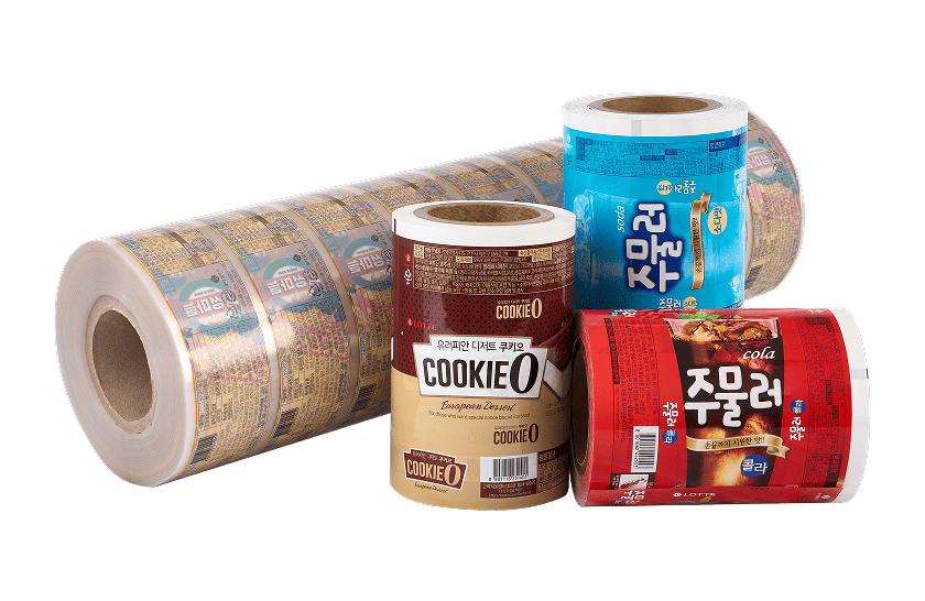 다양한 인쇄와 라미네이션 공정을 거쳐 제작되며, 자동 포장 기계에 세팅하여 원하는 형태의 파우치를 대량 생산할 수 있도록 제공됩니다.