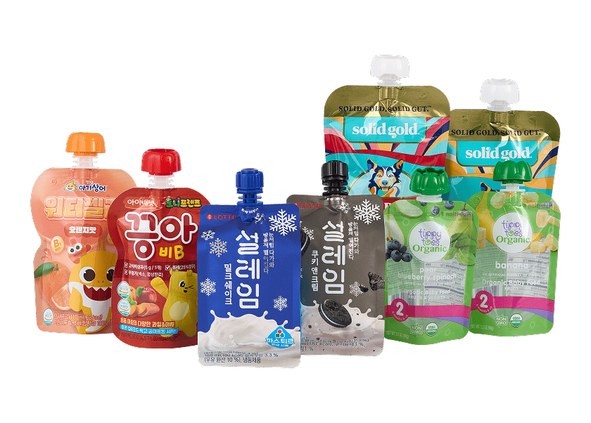 파우치 상단이나 측면에 마개(spout)를 부착하여 액상이나 분말 제품을 편리하게 주입·보관·소비할 수 있도록 만든 파우치입니다.